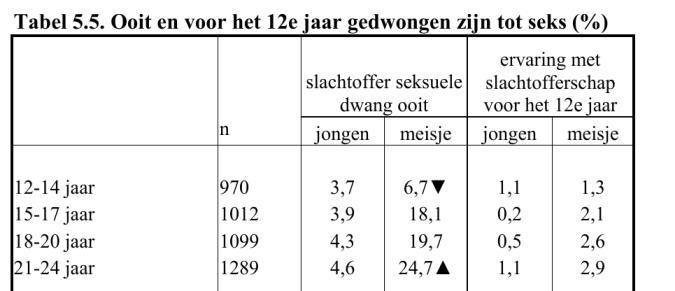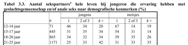 "Voor zowel jongens als meisjes geldt dat het percentage met seksuele ervaring toeneemt met de leeftijd. Van de 12- tot en met 14-jarigen heeft 7% ervaring met geslachtsgemeenschap, onder 20- tot en met 25-jarigen is dit 88%. In de totale groep verschillen jongens en meisjes nauwelijks van elkaar wat betreft ervaring met verschillende vormen van seksueel gedrag. Alleen met masturbatie hebben in alle leeftijdsgroepen meer jongens dan meisjes ervaring. In de jongste leeftijdsgroep hebben jongens ook meer ervaring met andere vormen van seksueel gedrag, maar de verschillen zijn klein en nauwelijks significant. Op 17-jarige leeftijd hebben meer meisjes dan jongens ervaring met tongzoenen, geslachtsgemeenschap en orale seks. Deze meisjes doen hun ervaring over het algemeen op met oudere partners, hetgeen het sekseverschil op deze leeftijd zou kunnen verklaren. In de oudere leeftijdsgroepen (vanaf 20 jaar) zijn deze verschillen tussen jongens en meisjes verdwenen." [mijn nadruk]