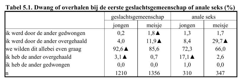 "Wanneer de eerste geslachtsgemeenschap met 13 jaar of eerder plaatsvond, is de kans relatief groot dat iemand hiertoe werd overgehaald. Binnen deze groep zegt 32% van de meisjes en 8% van de jongens de eerste keer te zijn overgehaald. Binnen de groep waarbij de eerste keer met 14 of 15 jaar plaatsvond zijn deze percentages al gedaald naar respectievelijk 16 en 5%." [mijn nadruk]