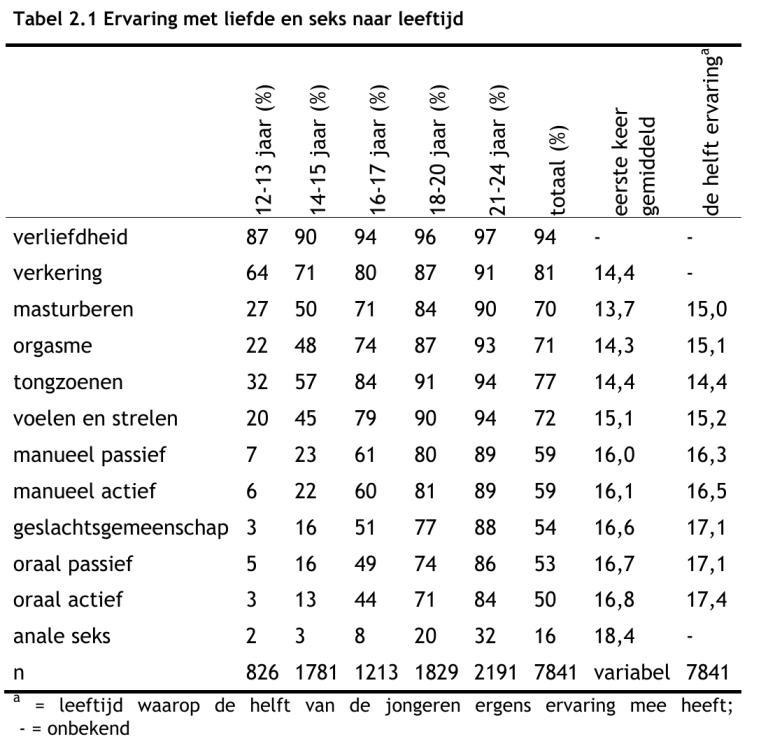 "Het aantal verschillende partners waar jongeren in hun hele leven geslachtsgemeenschap en/of anale seks mee hebben gehad, is nagevraagd met een open vraag. Het aantal dat hier werd ingevuld is vervolgens gecategoriseerd. Bijna de helft van de jongeren van 12 tot 25 jaar hebben nog helemaal geen sekspartners. De groep die wel ervaring heeft met geslachtsgemeenschap en/of anale seks, is ongeveer gelijk verdeeld over jongeren met één sekspartner, twee of drie sekspartners, of vier of meer sekspartners."(51)