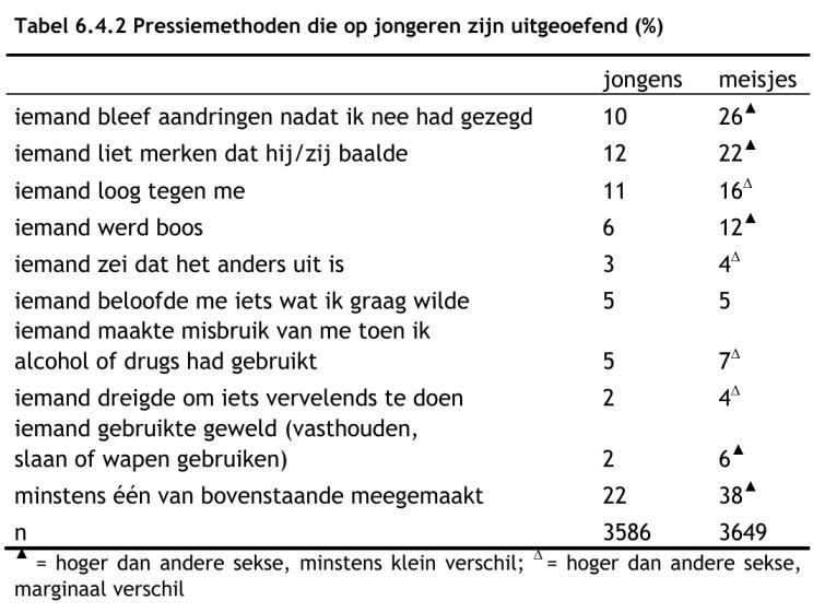 "Meisjes geven in alle situaties vaker dan jongens aan dat ze ongewilde seks waarschijnlijk of zeker wel zouden kunnen weigeren. Jongens geven in alle situaties juist vaker dan meisjes aan dat ze dit waarschijnlijk of zeker niet zouden kunnen.." [mijn nadruk] (126)