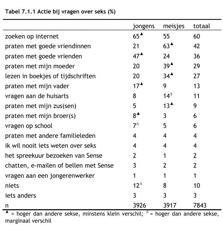 "Meisjes praten over vrijwel alle seksuele thema’s vaker met hun ouders dan jongens, alleen over wensen (dingen die je zou willen doen op seksueel gebied) praten jongens en meisjes ongeveer evenveel."(138)