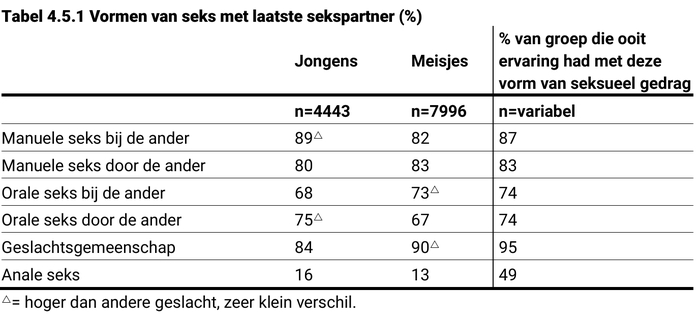 "Van de seksueel ervaren jongeren had het merendeel manuele, orale en/of vaginale seks met de laatste sekspartner. Meisjes geven iets vaker orale seks, jongens ontvangen dit iets vaker. Anale seks is een uitzondering: in de totale groep ervaren jongeren deed 16% van de jongens en 13% van de meisjes dit met de laatste sekspartner."(71)