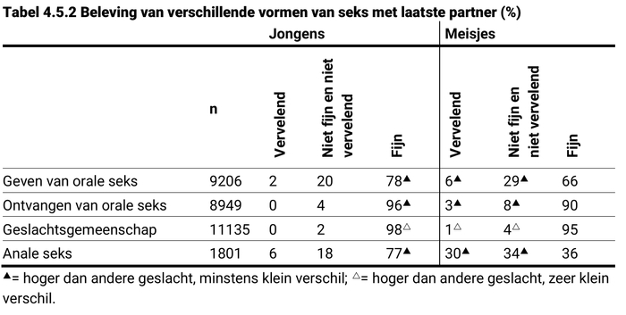 "Vrijwel alle jongeren vinden geslachtsgemeenschap en het ontvangen van orale seks fijn. Drie op de vier jongens en twee op de drie meisjes vinden het geven van orale seks ook fijn. Voor anale seks is dit percentage voor jongens ongeveer even groot, maar voor meisjes veel kleiner. Een derde van de meisjes die anale seks had met de laatste partner vond dit vervelend. Jongens vinden vrijwel alle vormen van seks prettiger dan meisjes. "(72)