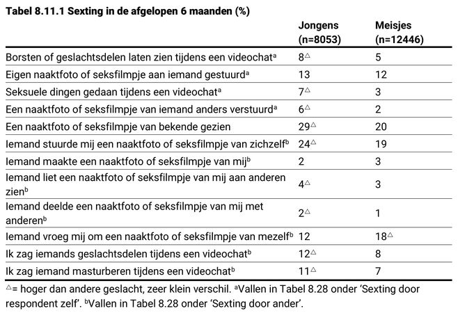 "Jongeren zeggen op school met name informatie te hebben gekregen over voorplanting, anticonceptie en soa’s: de meerderheid van de jongeren geeft aan hier voldoende of veel informatie over te hebben gekregen. Jongeren gaven aan minder informatie te hebben ontvangen over seks in de media, het versturen van naaktfoto’s en seksfilmpjes (sexting) en de leuke kanten van seks. Zo geeft 4 op de 10 jongeren aan op school geen informatie te hebben gekregen over sexting. Meisjes geven vaker dan jongens aan dat ze weinig of geen informatie hebben gekregen over de leuke kanten van seks (82% van de meisjes tegenover 72% van de jongens). De meeste jongeren krijgen wel enige informatie over seks op school: in totaal zegt 6% van de jongens en 5% van de meisjes over geen enkele van de genoemde onderwerpen informatie te hebben gekregen (niet in tabel). " [mijn nadruk] (159-160)